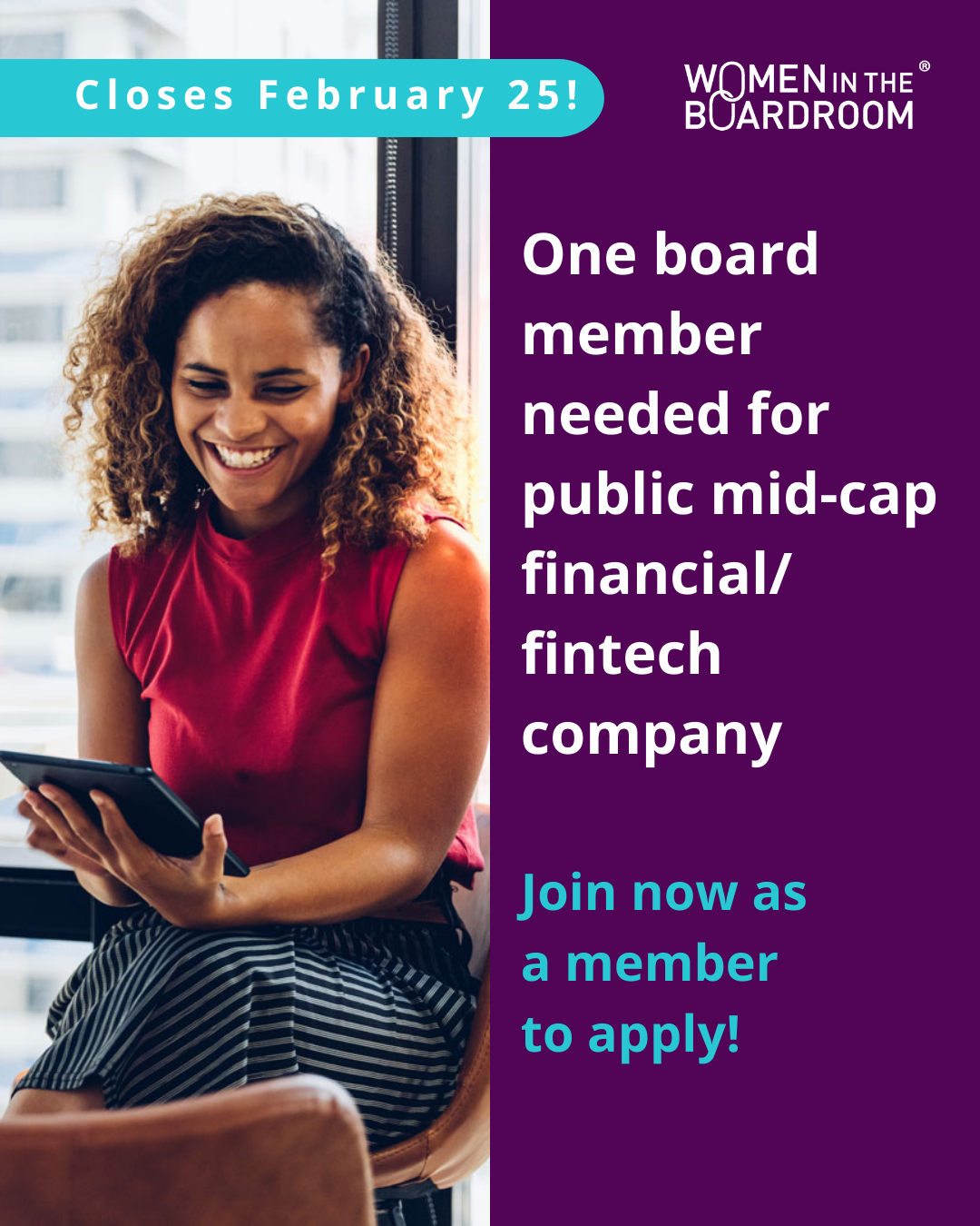 Public mid-cap financial/fintech company Seeking experience in: Technology, Banking/finance, Financial reporting and/or marketing, Experienced global executive background.